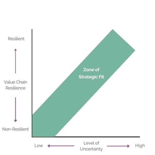 The main challenge then becomes to identify a ‘strategic fit’ with regard to the resilience measures that a company should implement. In Figure 1 you can see a visualisation of this approach[3]. The idea of strategic fit helps determine the necessary resilience actions and it refers to matching a chain’s capabilities with the level of uncertainty it faces. When demand is stable and supply risks are low, only a few actions are required, and the chain can focus more on efficiency. As uncertainty increases however, stronger resilience measures are needed to face potential disruptions. Some value chains already have natural advantages, such as relying on more resilient crops as feedstock, which allow them to perform well even in more uncertain conditions. The goal is to operate within the ‘zone of strategic fit’, where resilience and uncertainty are balanced effectively.